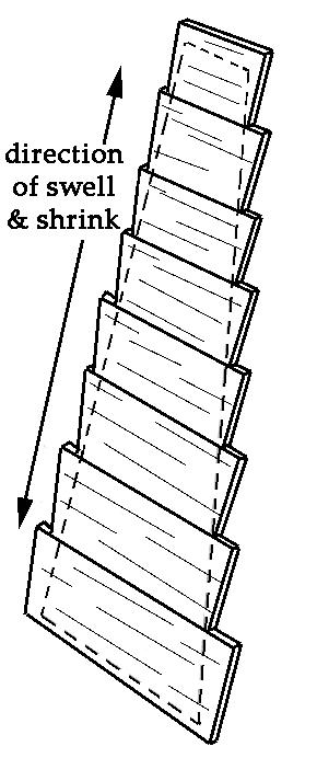 Another serious problem facing the solid soundboard builder is the issue of expansion and contraction due to humidity changes. Solid wood swells and shrinks across the grain lines quite dramatically from one season to another, especially in the northern climes where humidity often fluctuates from nearly 100 percent in the summer to less than 20 percent in the winter. Just as a new pair of pants will shrink in the clothes drier, a solid wood panel will also contract as it dries.